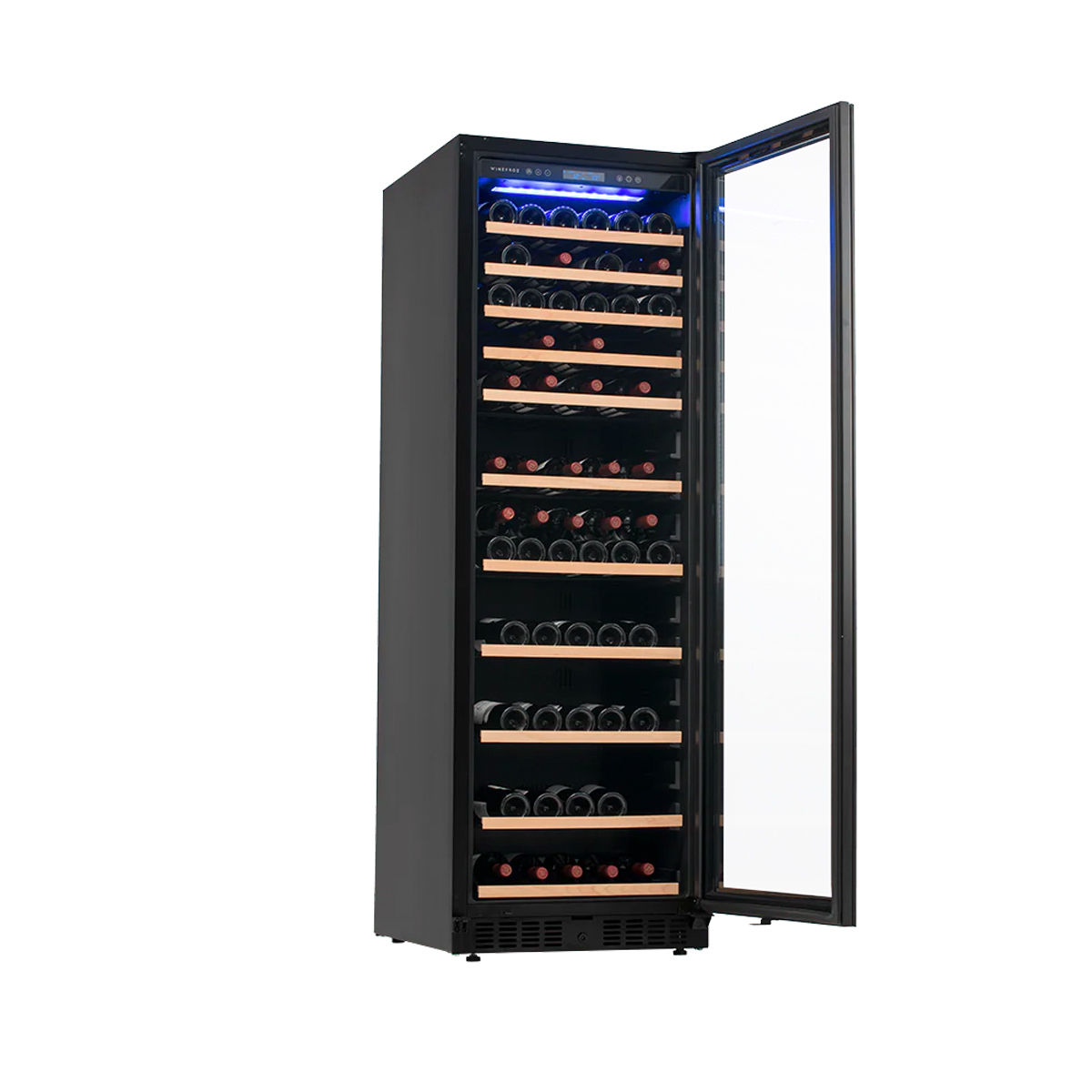 Las cavas premium de vinos Winefroz mantienen un equilibrio ideal entre temperatura, iluminación y humedad. El modelo GD500S, de simple temperatura, tiene puerta de vidrio espejada y permite regularla entre 5ºC a 20ºC según el tipo de vino que desea conservar y mantiene la humedad controlada entre 60-75% . Tiene una capacidad máxima para 166 botellas y cuenta con motor compresor. Contiene 11 estantes con frente de madera